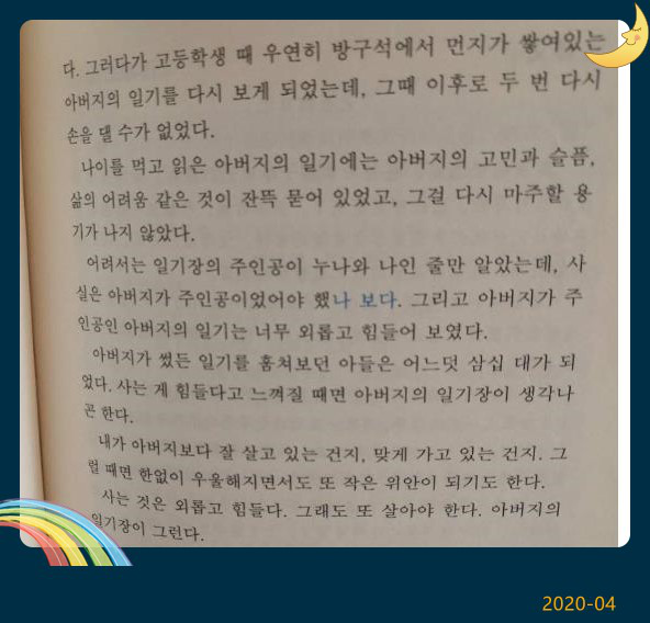 小時候,我以為日記的主人公是我和姐姐,而實際上爸爸才應(yīng)該是日記的主人公。而且,日記中的爸爸看起來異常孤單疲憊。那個曾經(jīng)偷看爸爸日記的兒子現(xiàn)在也已經(jīng)30多歲了,每當(dāng)我為生活而感到疲憊的時候,我都會想起爸爸的日記。